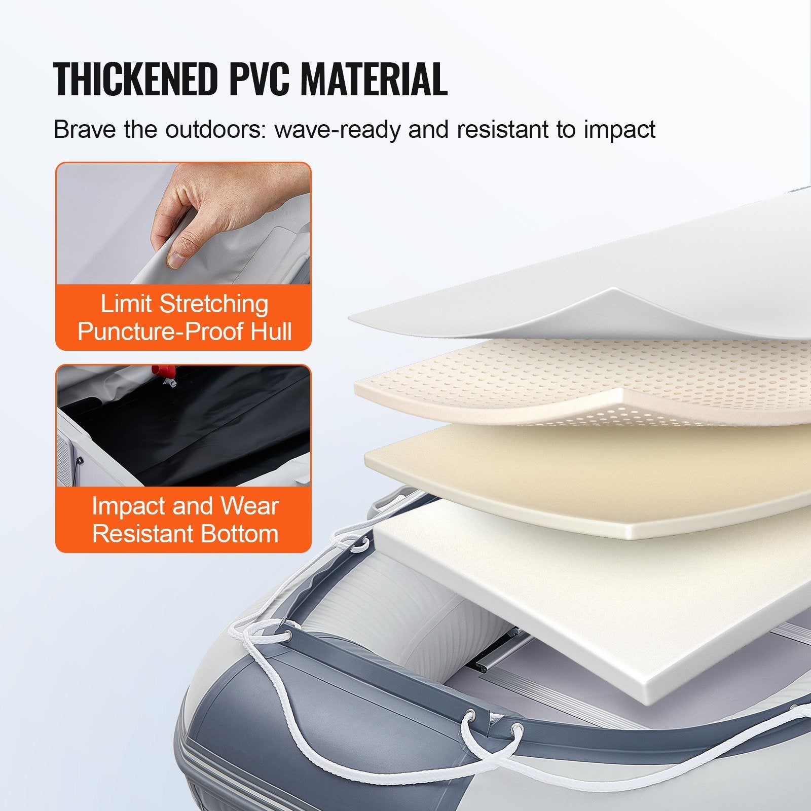 Robust Construction: Constructed with thick PVC for superior tensile strength and puncture resistance, this inflatable dinghy boat is sea-ready and equipped to handle waves, sand impact, and seawater erosion. The upgraded design includes 4 independent air chambers for added safety, ensuring that damage to one doesn’t compromise the boat’s buoyancy.